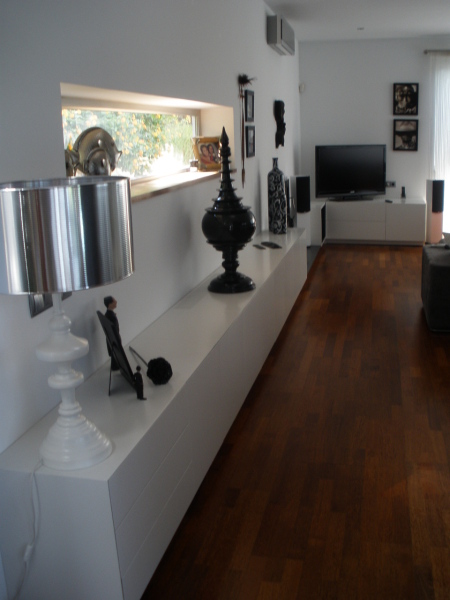 Vivienda unifamiliar de 1200 m2 ; Mobiliario italiano escogido de la casa Meridiani y Mocco ; tejidos de Gancedo y empapelados de Ulf Moritz. A destacar la actuación en el jardín exterior de estilo Zen.