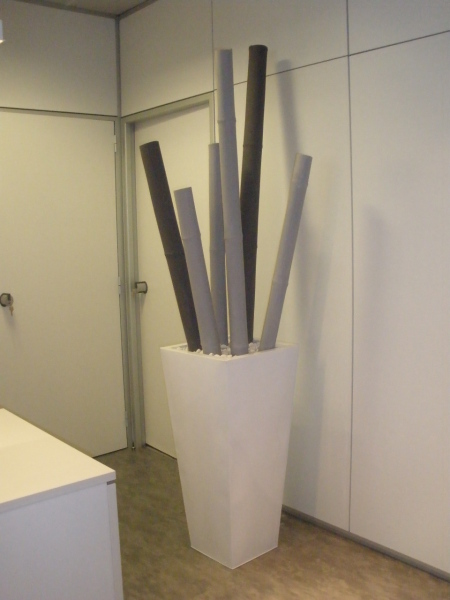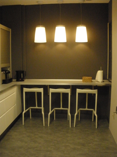 diseño y construcción del mobiliario combinando el lacado blanco crudo con madera de wengué.
