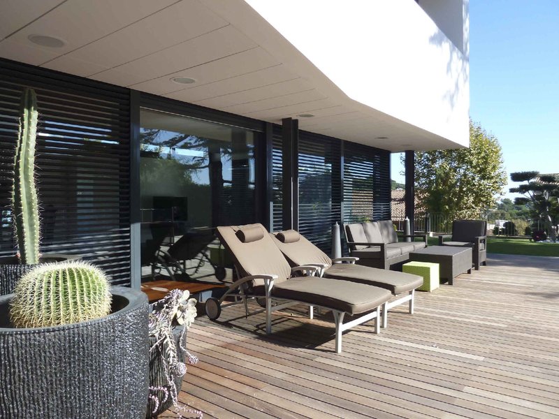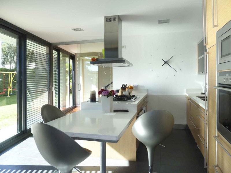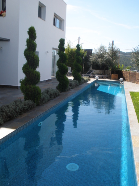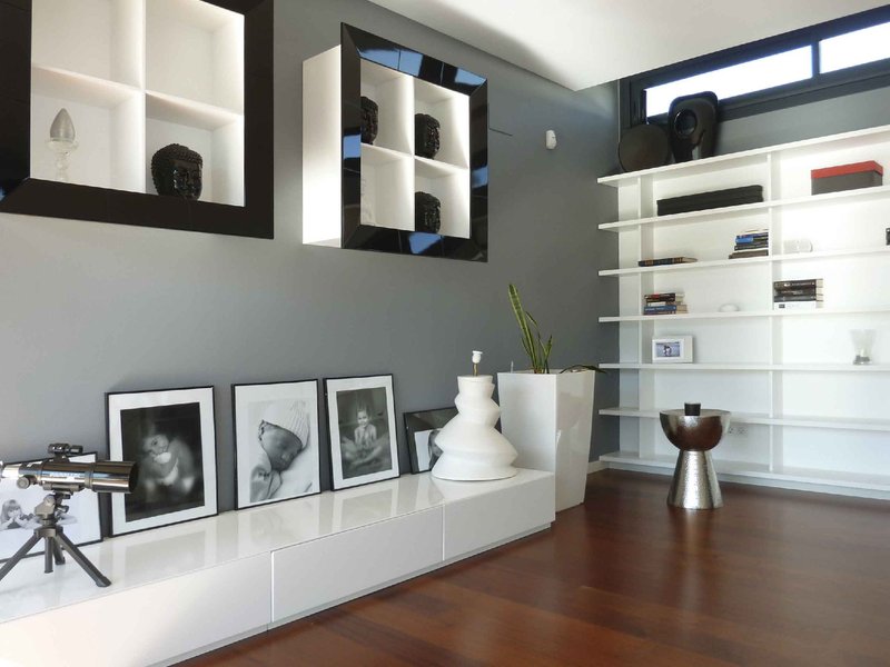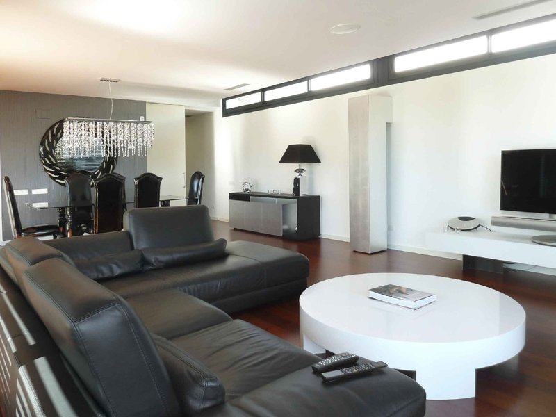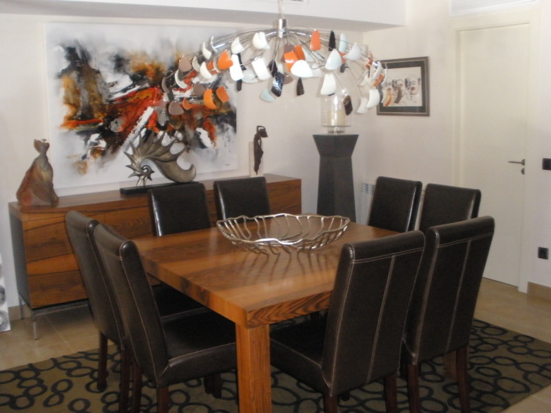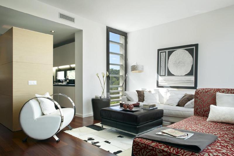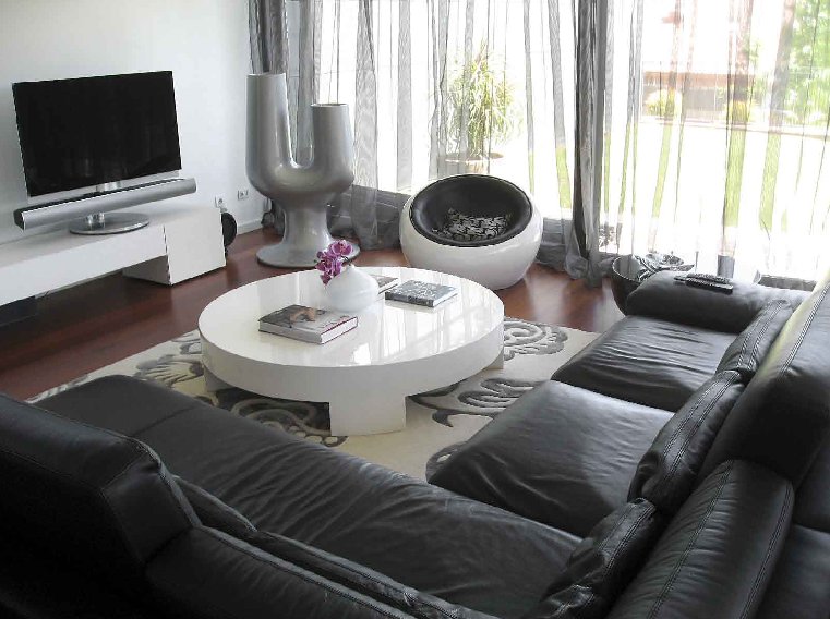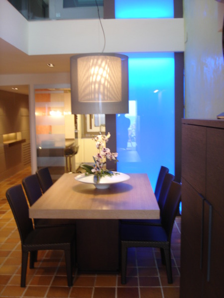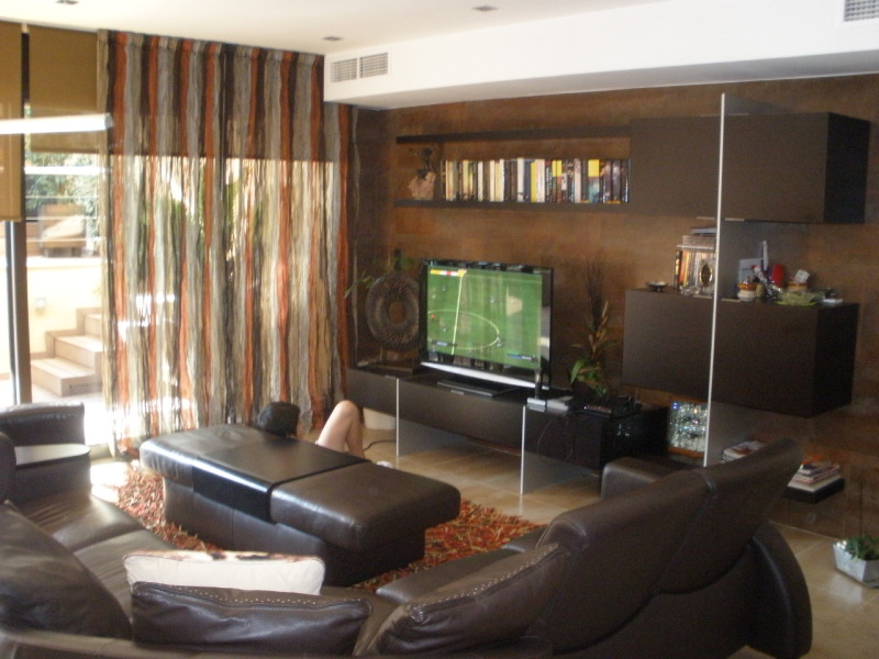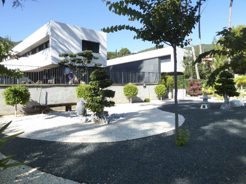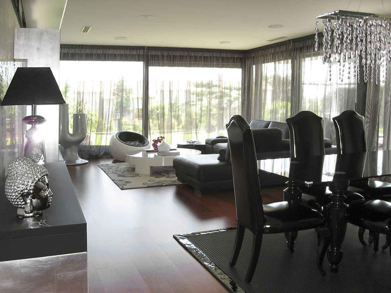 Vivienda unifamiliar de 1200 m2 ; Mobiliario italiano escogido de la casa Meridiani y Mocco ; tejidos de Gancedo y empapelados de Ulf Moritz. A destacar la actuación en el jardín exterior de estilo Zen.