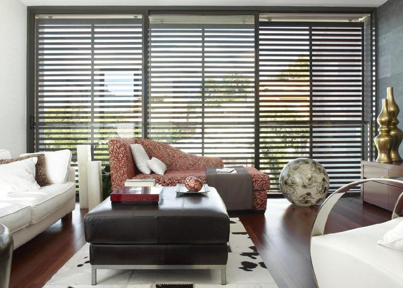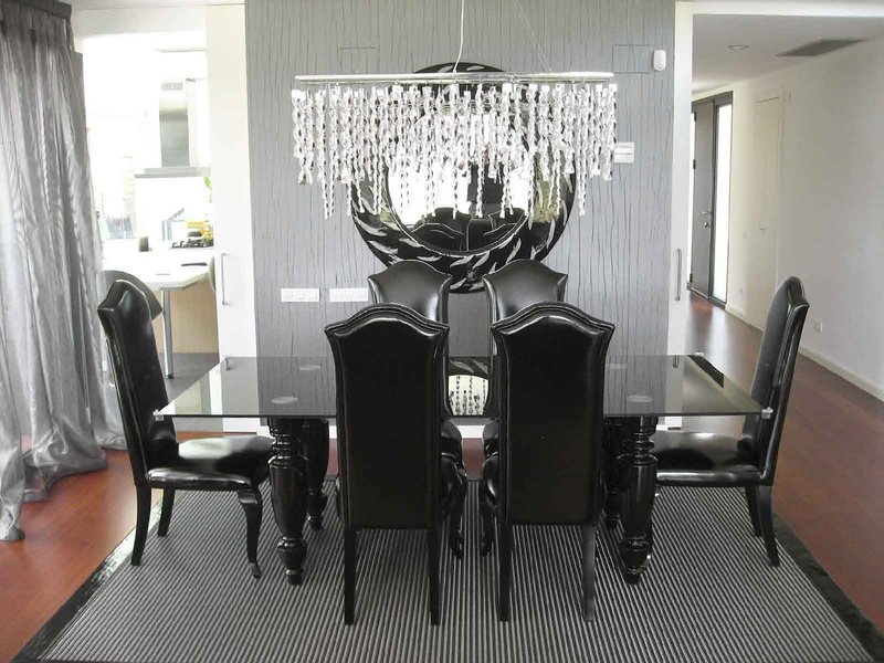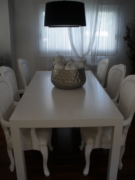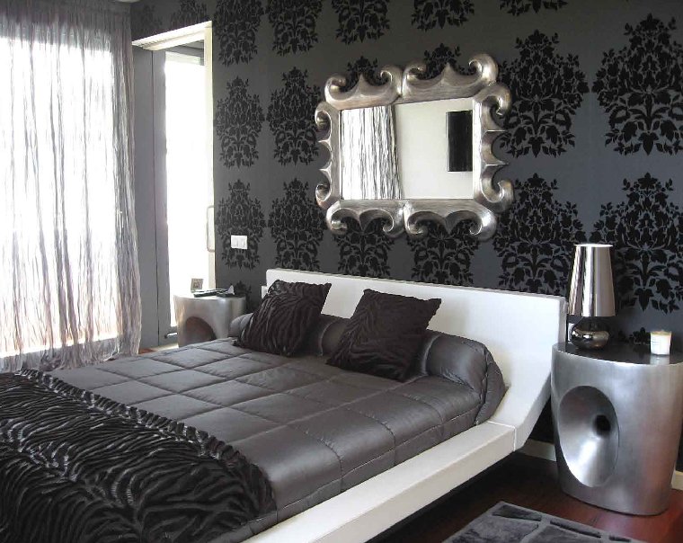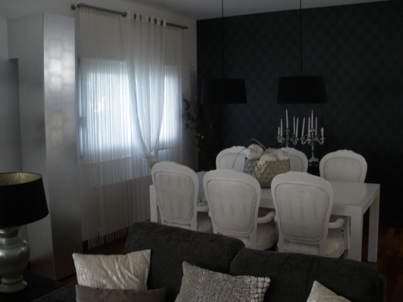 Decoración del salón-comedor siguiendo un estilo white&black : mobiliario diseñado en laca blanca combinado con muebles en pan de plata ; pantallas de organza negra y empapelado frontal barroco en tonos oscuros ; tapicería de Designers Guild