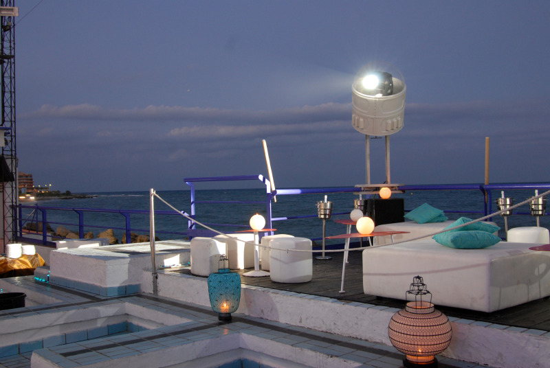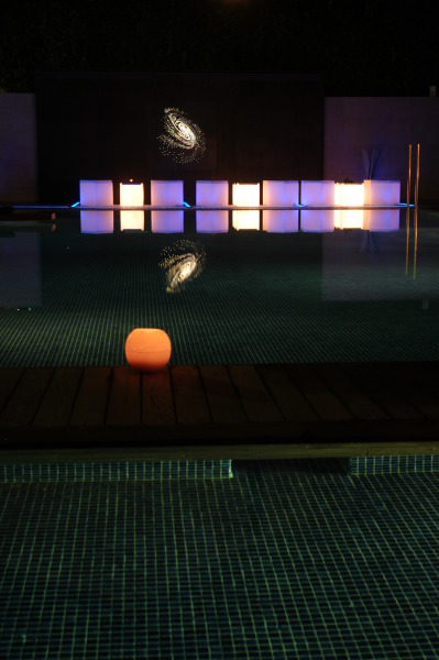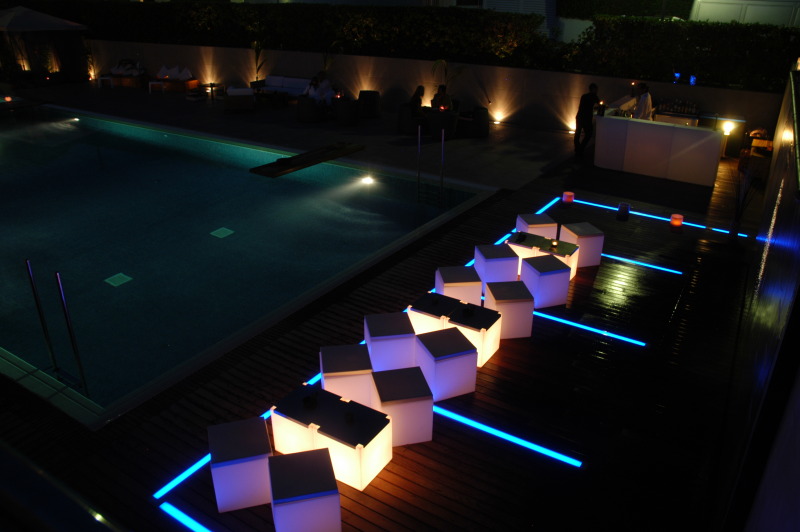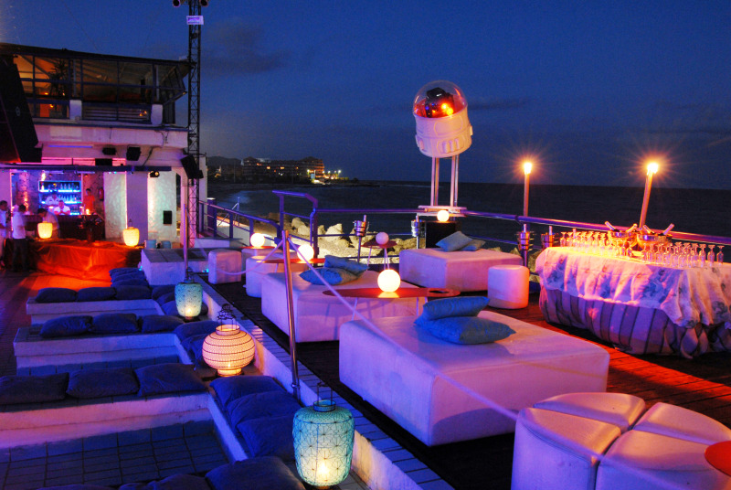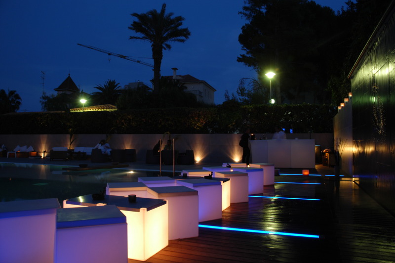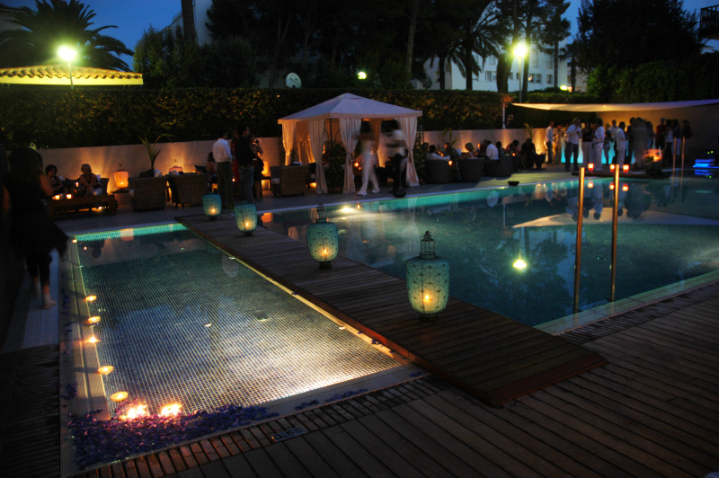 Se atrezzó el espacio chill-out del Hotel Antemare para su inauguración con mobiliario retroiluminado en color blanco, farolillos de estilo oriental en tonos azules y blancos; piscina ornamentada con pétalos de rosa y centros florales de mesa.