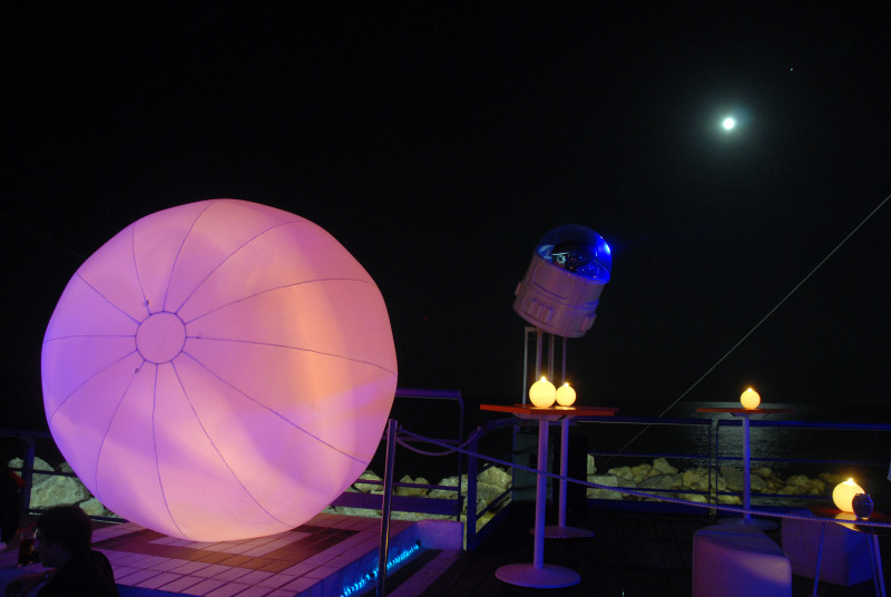 Atrezzo y decoración exterior para la discoteca Atlántida ; lámparas de farolillo de estilo oriental en color blanco y azul turquesa ; pouffs tapizados en blanco con tela naútica contrastados con cojines en damasco azul turquesa.
